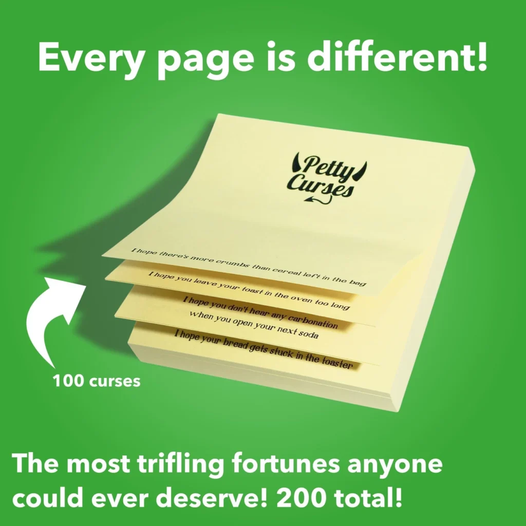 Funny Sticky Notes, Petty Blessings and Petty Curses, 100 Blessings and 100 Curses Sticky Note Pads, Hilariously Petty Fortunes Get ready for some light-hearted mischief with this pair of sticky note pads containing 100 blessings and 100 curses that aren’t too extreme. The blessings offer playful well-wishes like “May you find a parking spot near the front” and “May all your pills go down smoothly,” while the curses poke fun with harmless annoyances like “I hope your windshield wipers leave streaks” and “I hope your zipper gets misaligned.” With 98 other equally petty fortunes on each pad, these witty sticky notes make a delightfully cheeky gift for friends, coworkers, or anyone who appreciates a touch of tongue-in-cheek humor in their day. At 3 x 3 inches, they’re perfectly sized for leaving amusing notes around the home, office, or anywhere you want to spread some light-hearted laughs. Get Ready to Get Petty with this clever and entertaining sticky note set.
